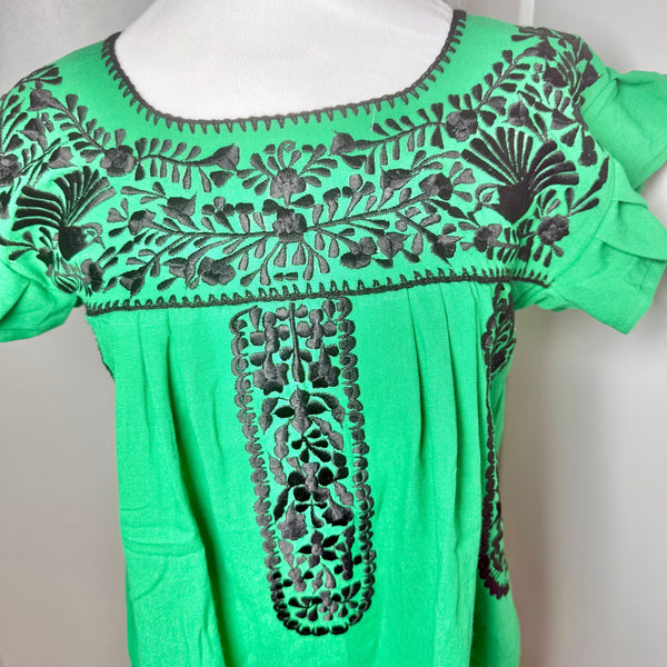 FELIZ PUEBLA EMBROIDERED BLOUSE - GREEN W/BLACK EMBRODERY