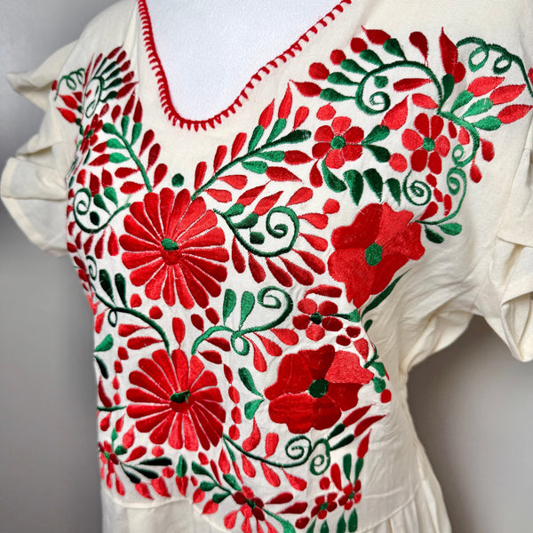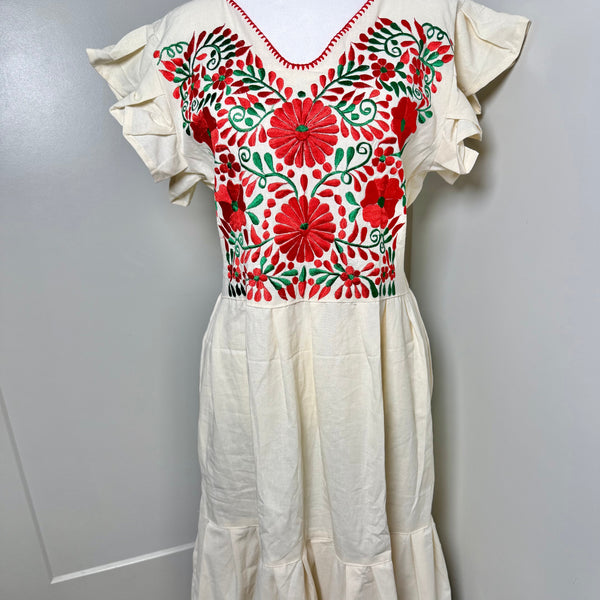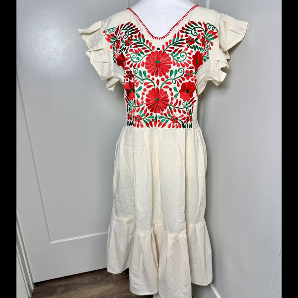 PALOMA DRESS - NATURAL W/RED & GREEN EMBROIDERY WITH POCKETS