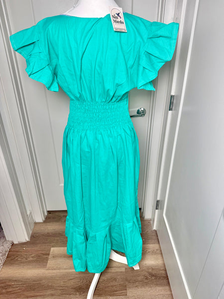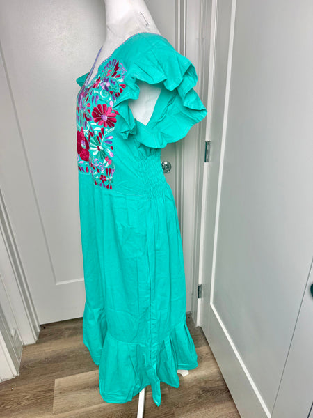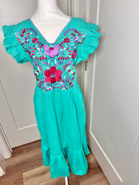 PALOMA DRESS (LONG) - TEAL WITH PURPLE & FUSCHA EMBROIDERY WITH POCKETS