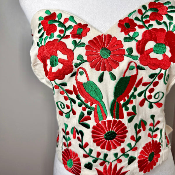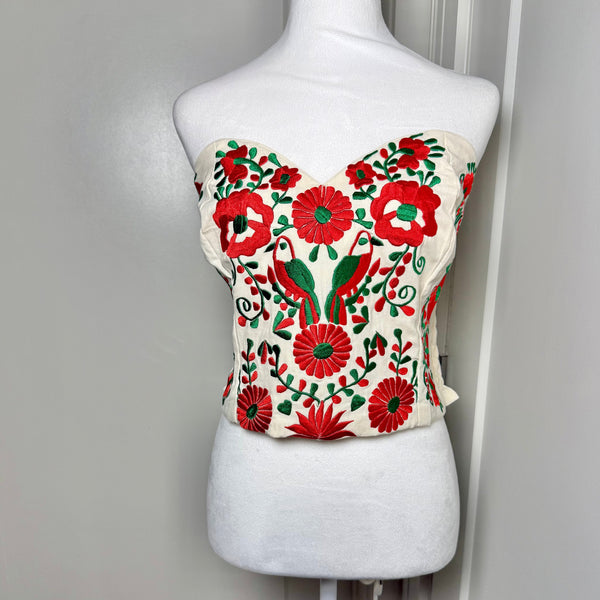 The Puebla Bustier - an embroidered masterpiece from skilled artisans in Puebla, Mexico. Perfect with jeans or shorts, this lightweight blouse adds a touch of unique style to any outfit. Made with love and expert craftsmanship, it's the perfect addition to your wardrobe! The Bustier is uni-size with a full elastic back, and will fit medium to x-large. The larger the size gets the shorter the bustier top will appear.